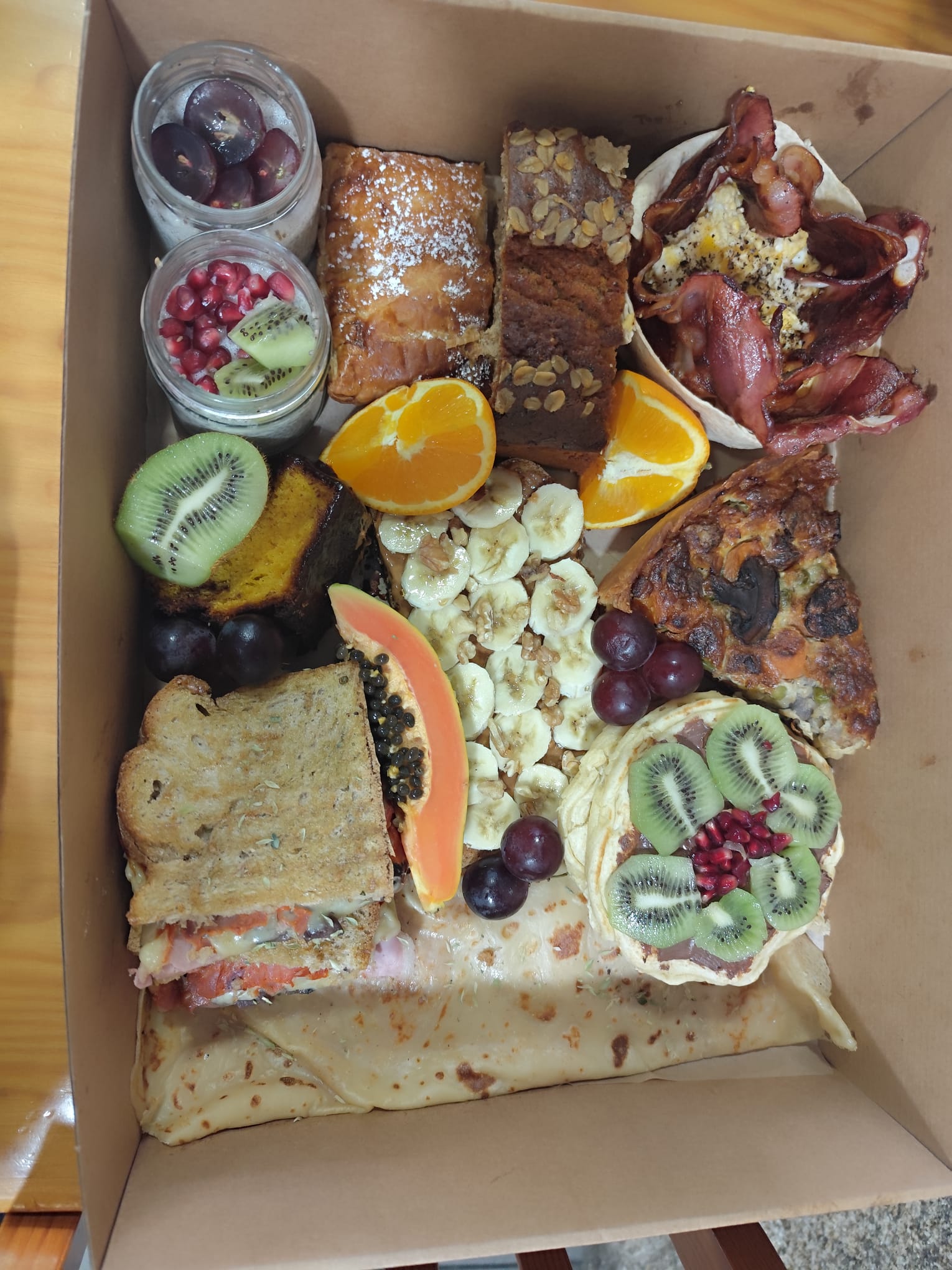 1. Caixa clementina, contém 6 surpresas d'avó, (doces e salgados), bacon & egges,1 crepe, 1 panqueca ,2 bebidas quentes, 2 bebidas frias.