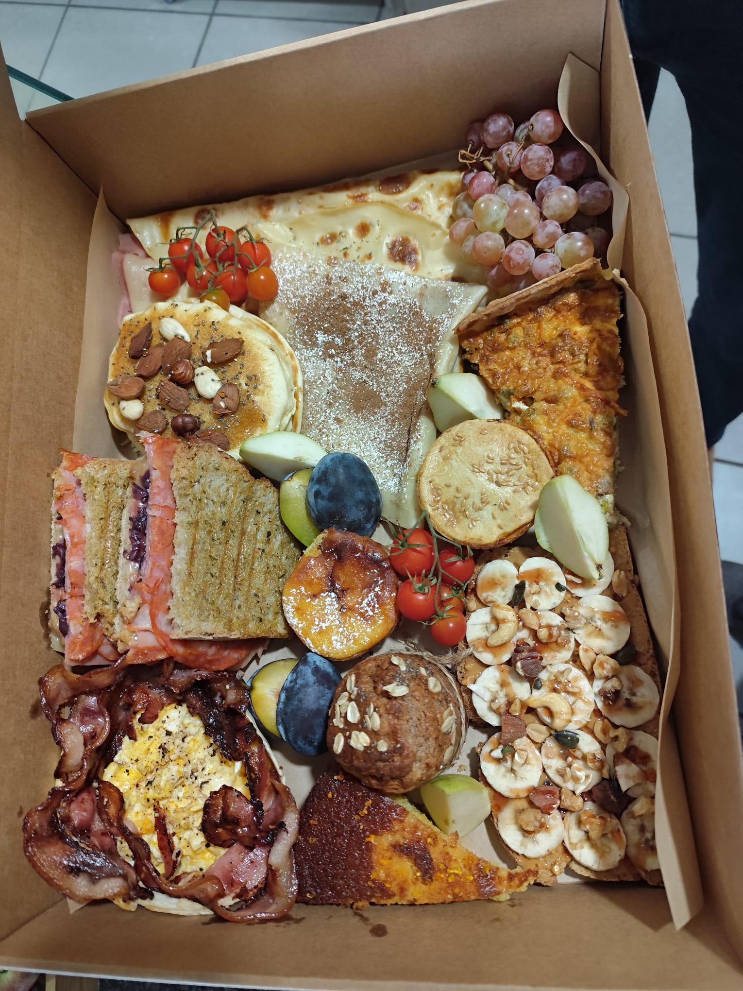 Inclui 6 surpresas do forno, 1 crepe, 1 panqueca, 2 bacon & eggs, 2 iogo-muesli e 4 bebidas.