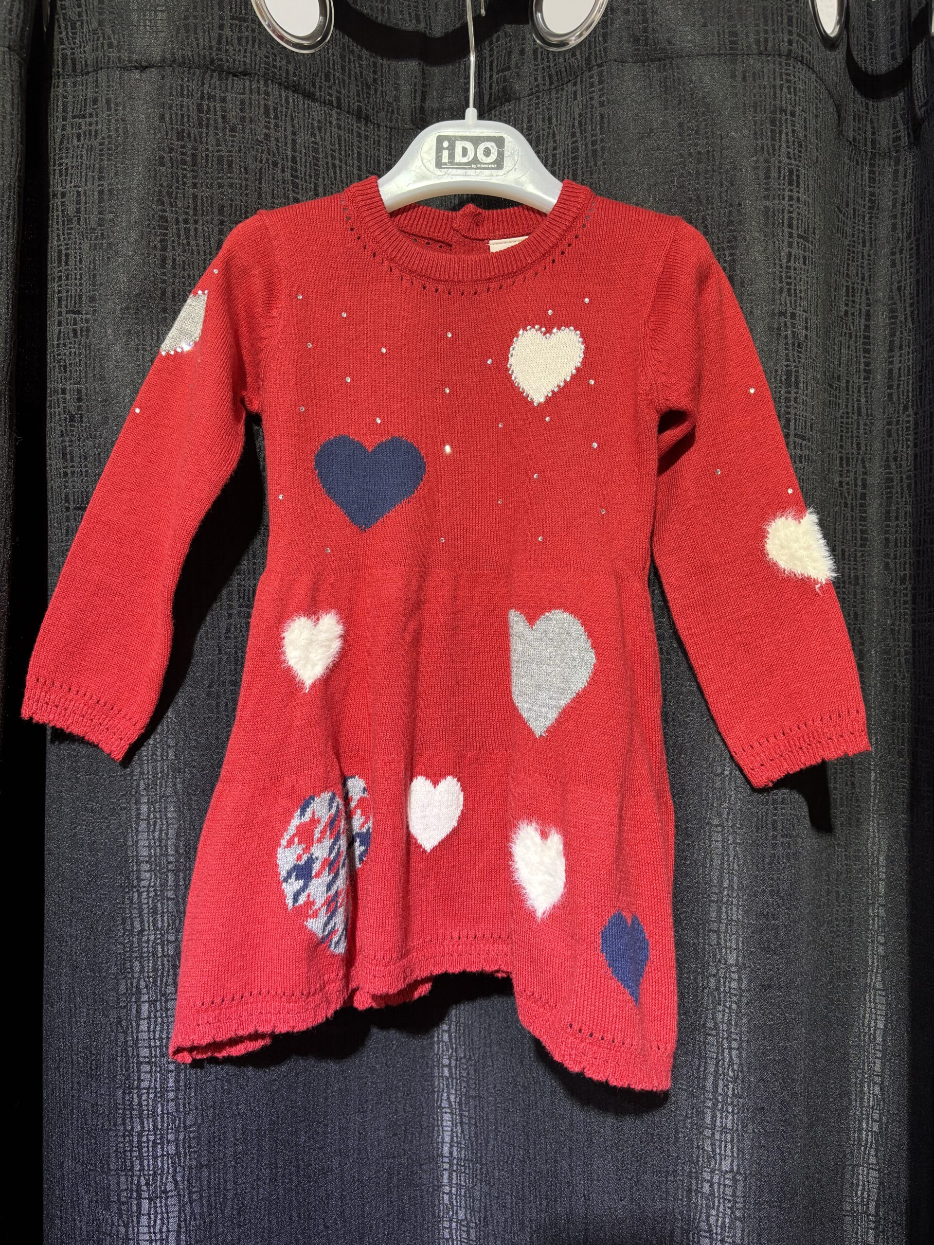 Vestido de malha de manga comprida num vermelho vibrante. A peça é decorada com corações em diferentes texturas e cores.
